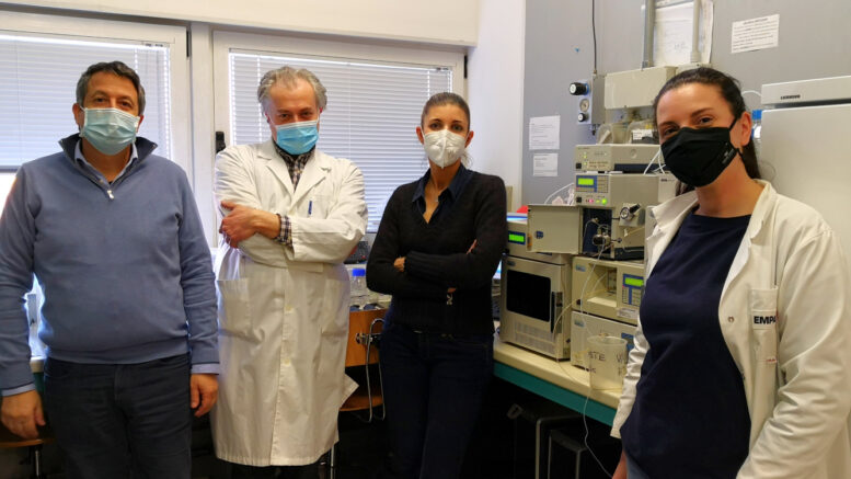 Nell’immagine, da sinistra: Loredano Pollegioni, Luciano Piubelli, Silvia Sacchi e Valentina Rabattoni con il cromatografo HPLC usato per la ricerca