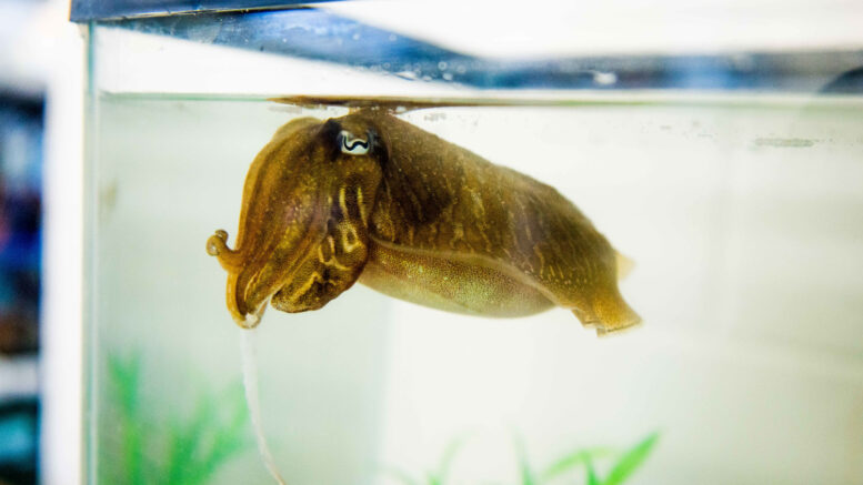 When I enter the marine laboratory in the morning, there’s always a chance I’m about to get soaked. You see, our crankiest common cuttlefish, called Franklin, has recently taken to squirting a water jet at me from her tank. I’ve decided it’s her grumpy way of saying she doesn’t want to participate in experiments, because Franklin never hoses me during my evening visits, which is when I’m only in the lab to give her dinner.