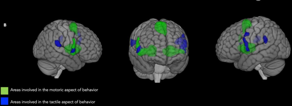 Nell’immagine fornitaci gentilmente dagli Autori, “The intersection of emotional recall on whole-body brain areas” (Figura B), sono rappresentate le aree comuni: ove indicate in blu, si attivano sia per le emozioni che per le stimolazioni tattili; ove in verde, sia per le emozioni che per le stimolazioni motorie.