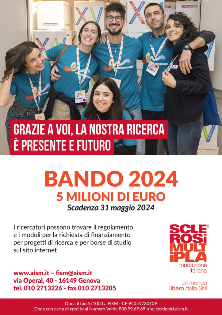 C’è tempo fino al 31 maggio per presentare progetti di ricerca in risposta al nuovo bando promosso dall’Associazione Italiana Sclerosi Multipla (AISM) attraverso la sua Fondazione (FISM), sostenuto dal 5xmille, per un totale di 5 milioni di euro.